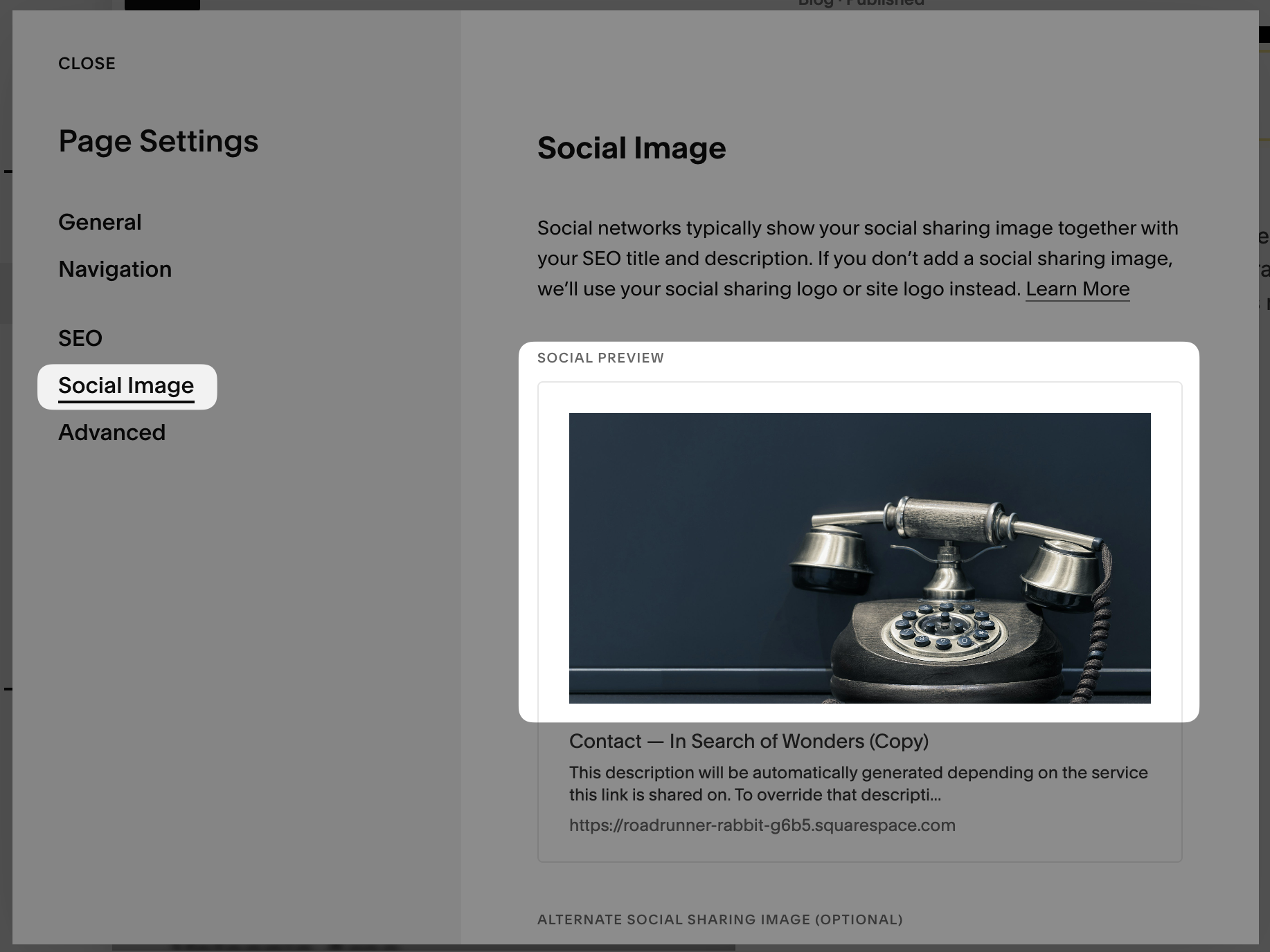 - For a blog page: we show the "Featured Image", which you can find in your Squarespace interface under Blog Post Settings. If no Feature Image is set, we'll show the "Social Image" (see below), and if that is also not set, we'll show the first valid image we can find on the page.