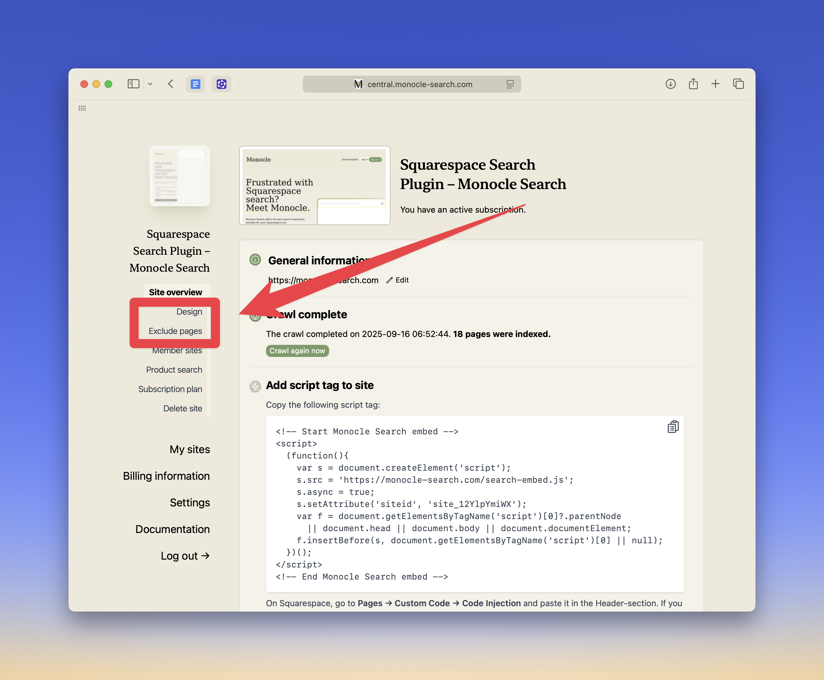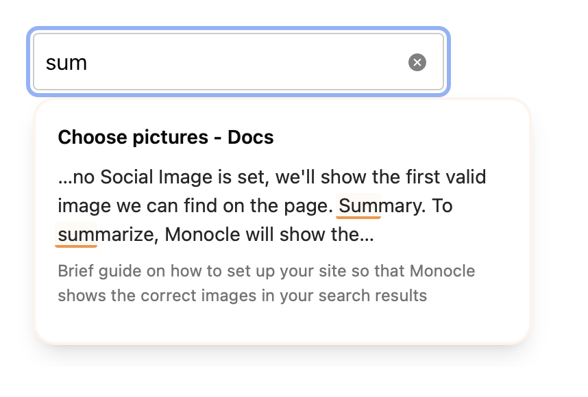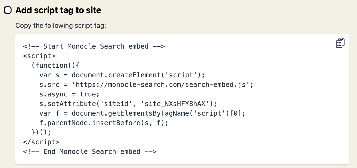 Success! While you’re digesting the next steps, Monocle is working away in the background and “indexing” your site, which means it’s reading and sorting all available content. You’re only two tasks away from having a blazingly fast search bar on your site now!