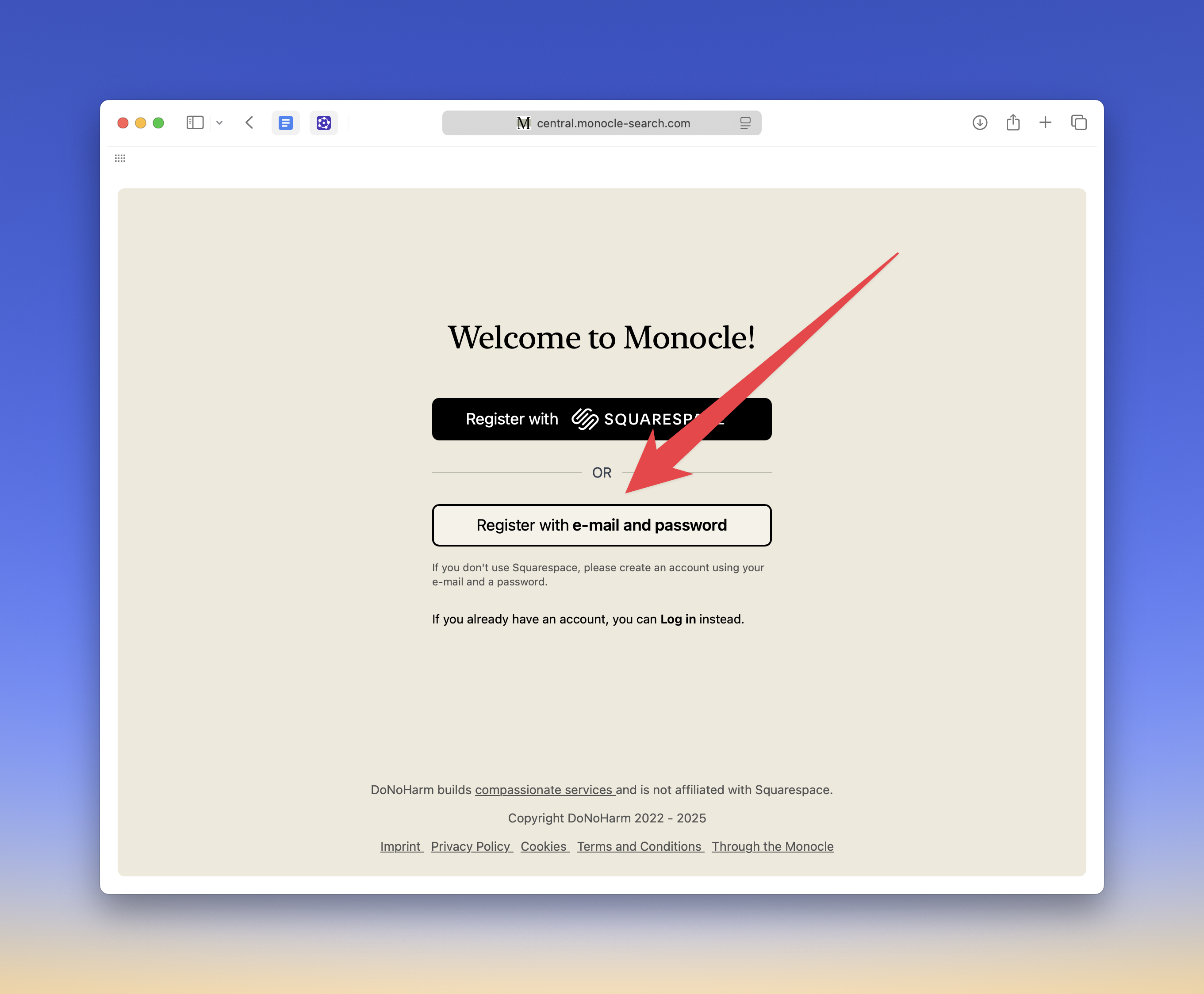 On monocle-search.com, click on Register in the upper right corner.