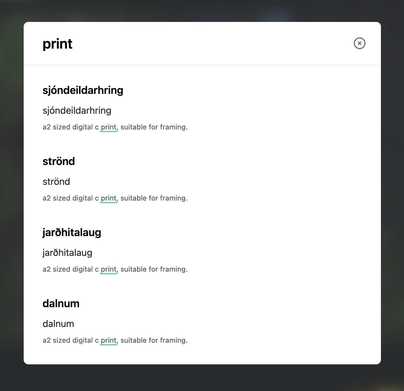 A driving factor for a successful online shop is getting your visitors to find your products quickly and in an engaging format. If you're using Monocle Search, it will automatically pick up on your products, but now show them in a particularly interesting way. For example, a list of prints may just look like this: